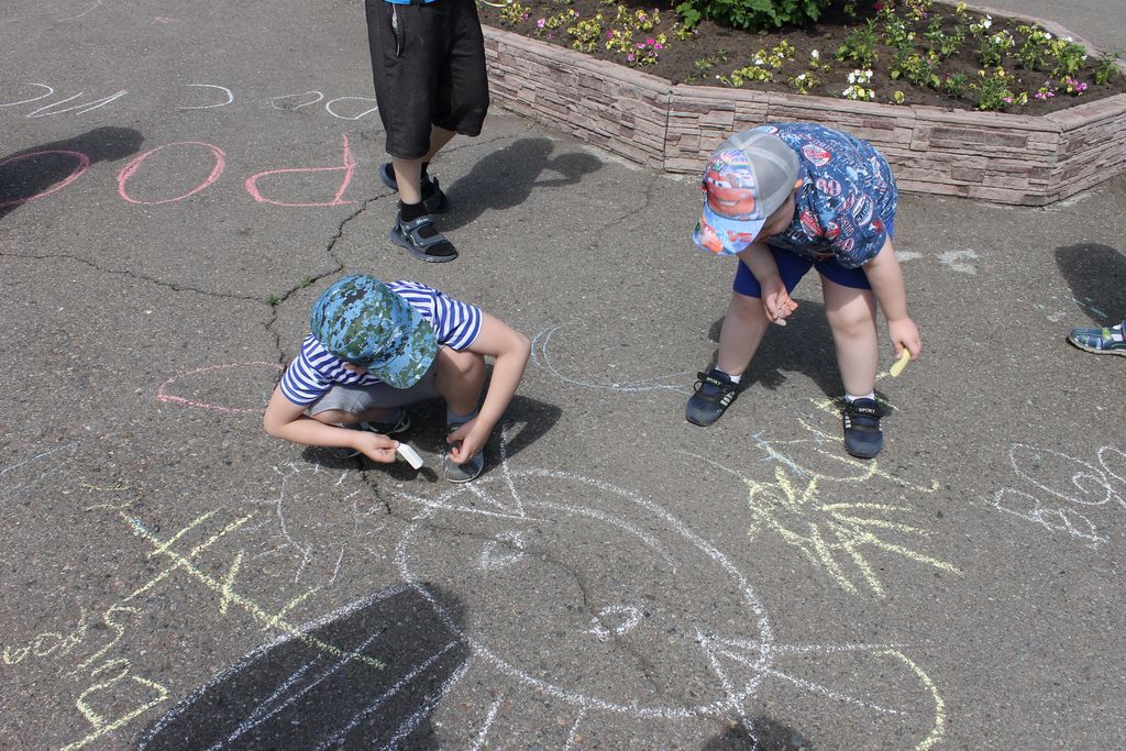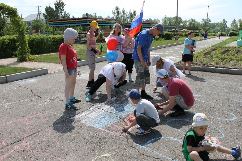 Небо, солнце, облака, главный символ нашей страны – флаг, все это быстро появлялось на художественной площадке. Вокруг царило ощущение праздника. Юные художники патриотично и с гордостью цветными мелками писали на асфальте всем знакомое слово – Россия.