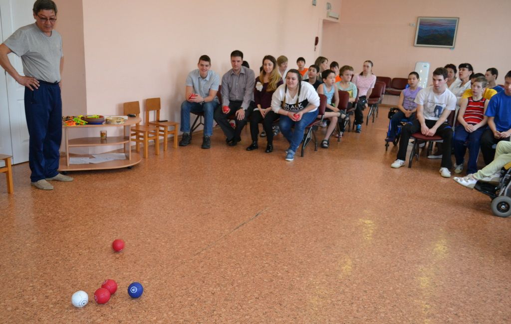 30 марта 2018 30 марта в нашем учреждении состоялись соревнования по бочча – спортивной игре с мячом. Весело и азартно соревновались две команды: синие - воспитанники, красные – сотрудники и педагоги. Победу одержали дети, ведь с ними 4 раза в неделю с января занимается тренер ГБУ РХ «СШАС «Ирбис» Касьянов Д.А. Он познакомил детей с правилами новой адаптивной спортивной игры для людей с нарушениями опорно-двигательного аппарата любого возраста, научил различным приемам игры.