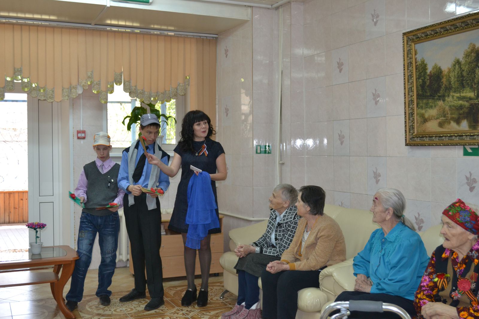 Накануне праздника в рамках акции «Синий платочек», проводимой Хакасским региональным отделением ВОД "Матери России", ребята дома-интерната посетили Абаканский Пансионат ветеранов, где поздравили вдов и ветеранов с праздником, подарили открытки, сделанные своими руками, и повязали на шею голубые платочки.