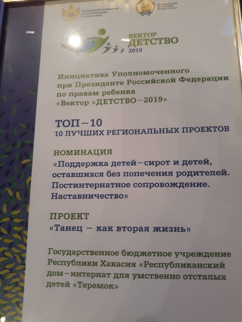 16 мая 2019 С 14 по 16 мая в городе Уфа Проект «Танец-как вторая жизнь» ГБУ РХ «Республиканский дом-интернат для детей «Теремок» принял участие в Инициативе Уполномоченного при Президенте Российской Федерации по правам ребенка «Вектор «Детство-2019», который вошел в топ-10 лучших региональных проектов в номинации «Поддержка детей-сирот и детей, оставшихся без попечения родителей. Постинтернатное сопровождение. Наставничество». Награду для учреждения получила Уполномоченный по правам ребенка в РХ Ауль Ирина Евгеньевна.