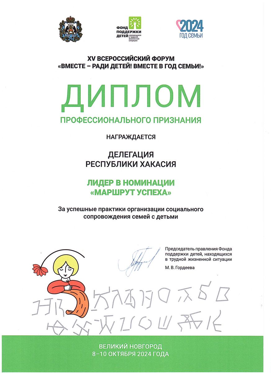14 октября 2024 На XV Всероссийском форуме «Вместе - ради детей! Вместе в год семьи!» на выставочной интерактивной площадке от Республики Хакасия была представлена практика реабилитационной работы с семьями детей-инвалидов в условиях полустационарного обслуживания «Мы – одна семья». ГБУ РХ «Республиканский дом-интернат для детей «Теремок» стал лидером в номинации «Маршрут успеха» и получил диплом профессионального признания.