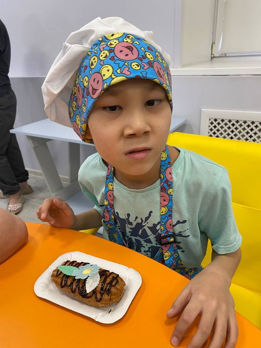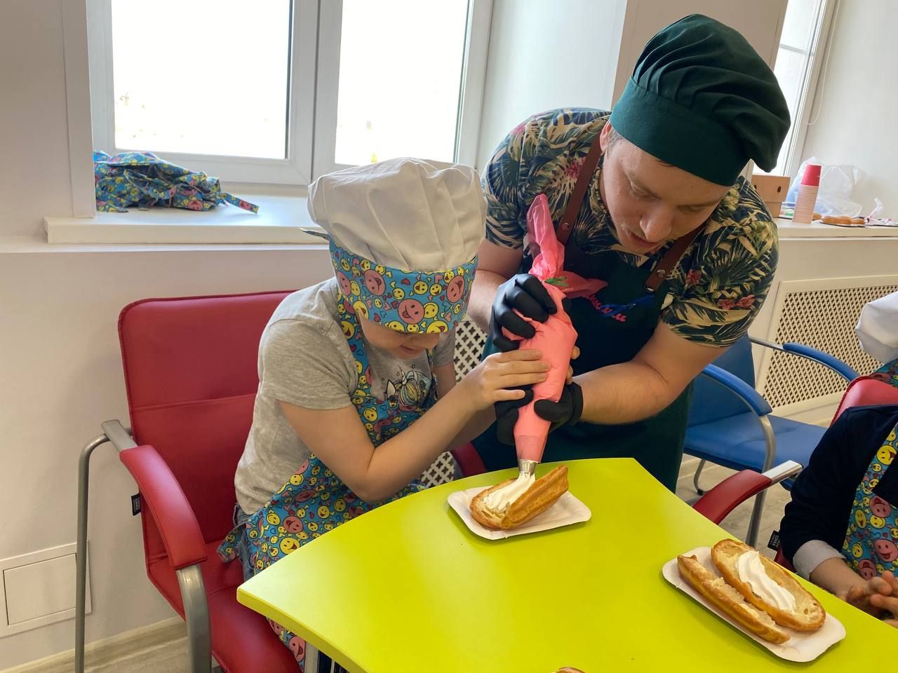 Ребят научили начинять эклеры пышным безе, покрывать их шоколадной глазурью и кондитерскими украшениями. Дети внимательно слушали и повторяли все действия пошагово.