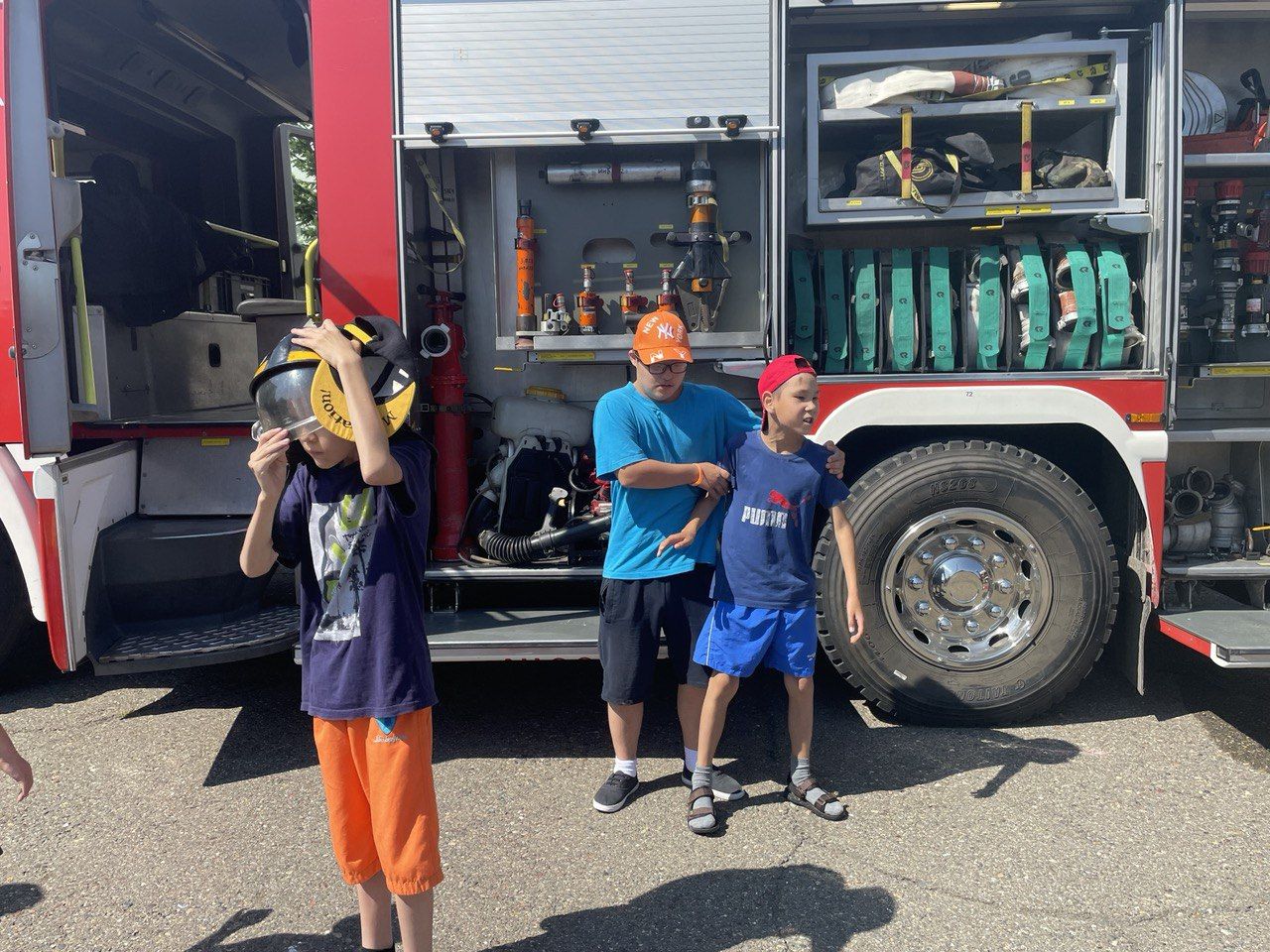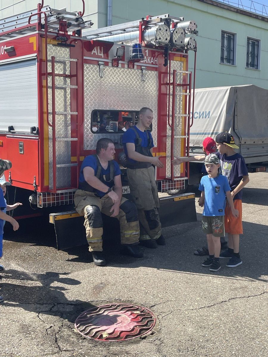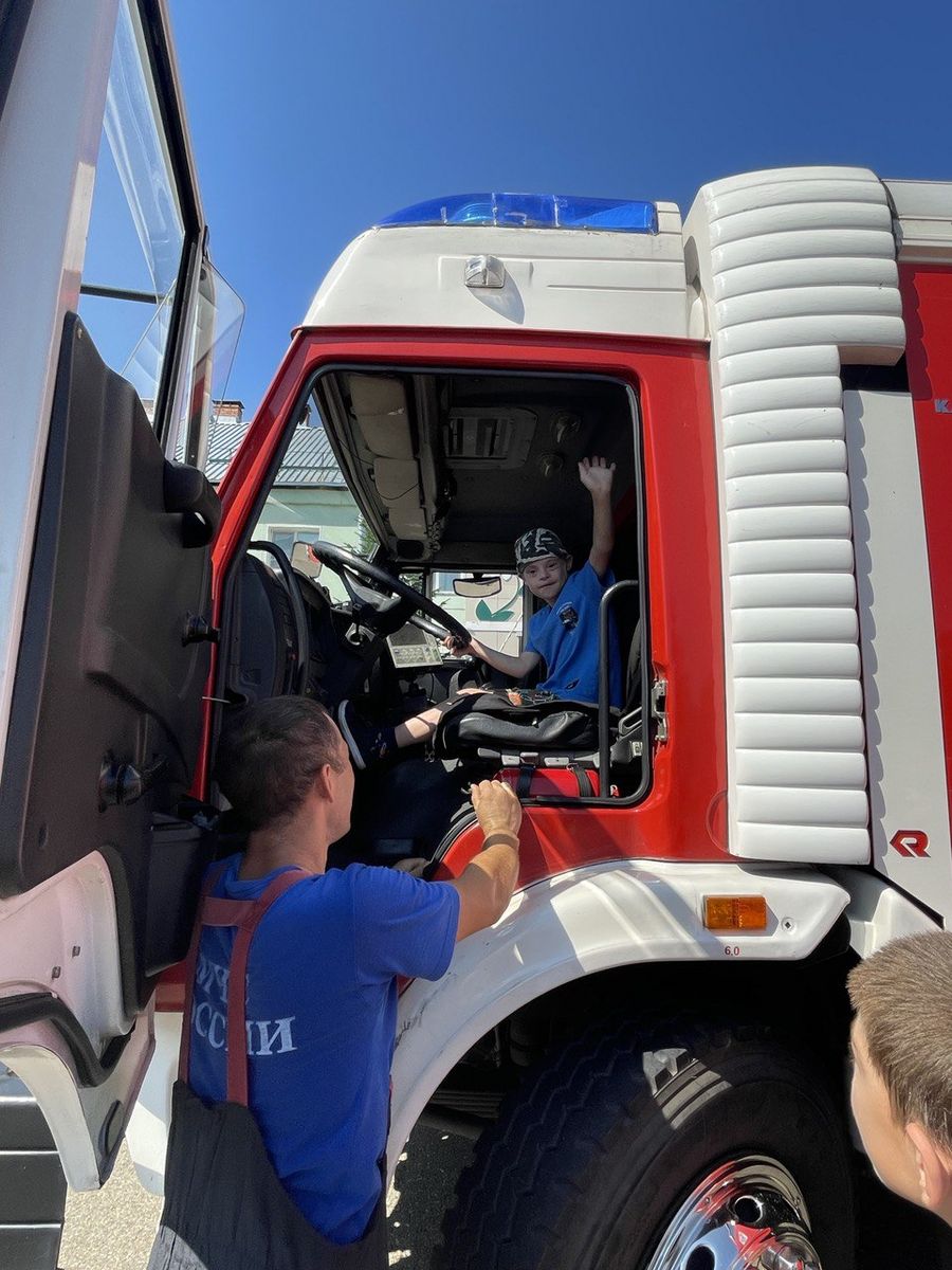 После того, как пожарные выполнили свои поставленные задачи, познакомили наших ребятишек с профессией пожарного. Детям разрешили посидеть в кабине пожарной машины, полили водой газон и елки из пожарного рукава, а также примерить шлем-каску пожарного. Восторгу детей не было придела!