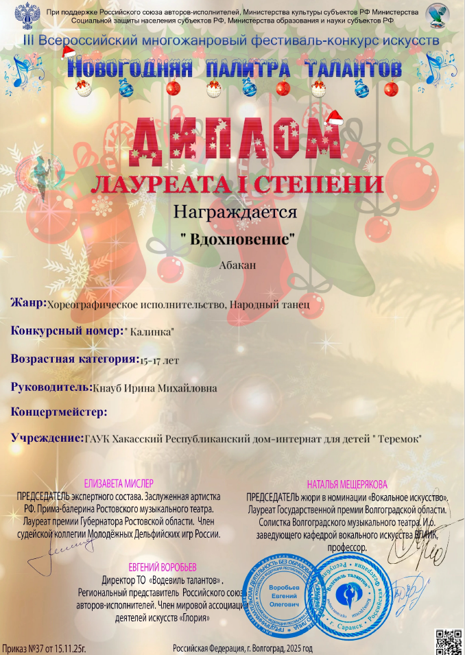 26 января 2026 В декабре 2025 года танцевальный коллектив дома-интерната «Вдохновение» принял участие в III Всероссийском многожанровом конкурсе-фестивале "Новогодняя палитра талантов". Это крупное профессиональное событие собрало талантливых артистов со всей страны, предоставив им возможность продемонстрировать свои навыки и мастерство.